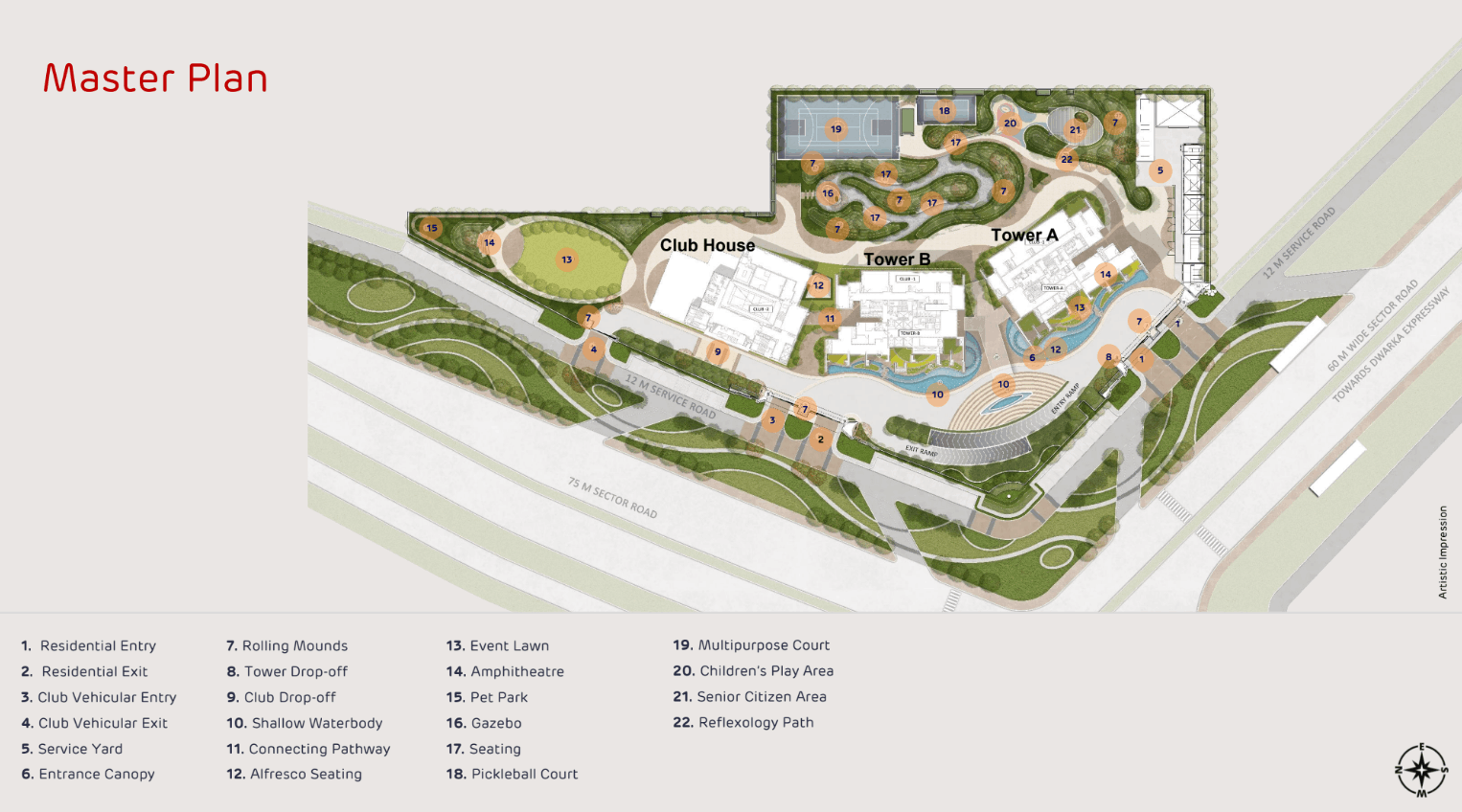 Positioned on the Dwarka Expressway in one of NCR’s most dynamic growth corridors, this development offers exceptional connectivity and convenience. Located just 1 min from Dwarka Expressway, 24 mins to IGI Airport, 35 mins to Delhi, and 16 mins to NH-48, you enjoy seamless access to major business hubs. Surrounded by transformative landmarks such as Global City, AIIMS, Yashobhoomi Convention Centre, and India’s largest ISBT at Sector 36A, this location is ideal for discerning professionals, families, and investors. The 5-acre corner development features zero surface vehicular movement with landscaped serenity, perfect for those seeking premium living with convenience.